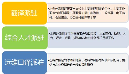 水树的现场驻派服务,是根据客户现场语言项目的需要,测试并挑选适合的人员进行必要的培训后,将人员派遣至客户的项目工作现场,派驻人员在客户指定的工作地点,按照客户指定的工作内容,提供翻译或其他语言相关的服务。
